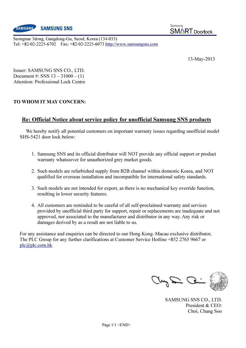 The PLC Group is the only authorized company designated by the Korean manufacture (Samsung SNS) as the Exclusive Distributor in Hong Kong & Macau since 2009 for all sales and official warranty protection.