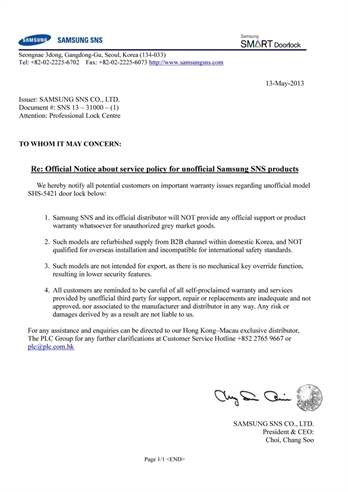 市面上一些未受许可或自称出售「韩国版本、原厂直接入口或平行进口」的非标准韩文字电子门锁, 它们全部都是水货或混杂货,主要来源是韩国当地建筑承包商在工程过后,将余下的劣质零件并成,未通过原厂检验的二手门锁。对消费者的家居构成威胁。所有原厂正货均有Samsung Smart Doorlock商标,并可有2年原厂保养(保证使用原厂零件维修),请到香港及澳门独家代理PLC各分店或特约经销商购买, 以获得最全面的购物保障。