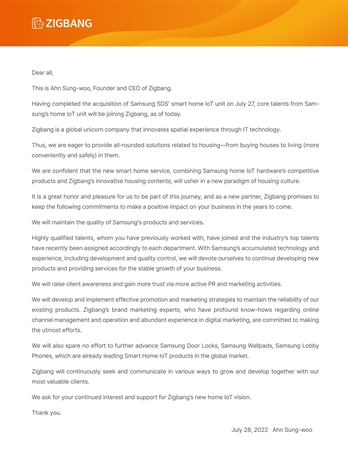 Zigbang Co., Ltd.(直帮,下称直帮)宣布于 2022 年 7 月 27 日成功收购三星 SDS 家居物联网项目部 (Samsung SDS Home IoT Unit) 的业务。